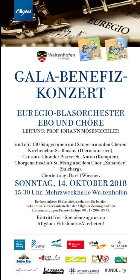 Die Alpspitzhalle in Nesselwang wird am Sonntag, 14. November um 15.30 Uhr zur Bühne einer Premiere: Das erste gemeinsame Galakonzert mit dem Euregio Blasorchester (EBO) und den Kulturpreisträgern der Dr. Dazert-Stiftung. Der Oberösterreicher Professor Johann Mösenbichler, Leiter des Fachs Blasorchesterdirigieren am Bruckner-Konservatorium in Linz sowie Euregio-Kulturbotschafter, hat die musikalische Gesamtleitung.