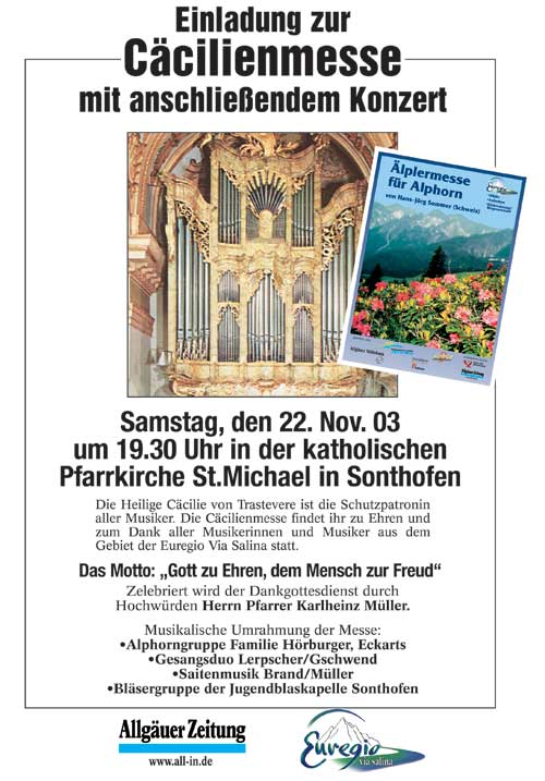 Sonthofen im zeichen volkstümlich-geistlicher Musik - diese Verbindung von Brauchtum und Religion hat Tradition, wie eine vollbesetzte St. Michaelskirche zeigte. Am Gedenktag der heiligen Cäcilie präsentierten die Schirmherren der Euregio via salina, Landrat Gebhard Kaiser und Bürgermeister Huber Buhl, auf Initiative von Toni Haßler und Simon Gehring für die Alphorngruppen der Region Allgäu-Außerfern-Kleinwalsertal eine neue "Älplermesse für Alphorn". Anschließend feierte man in der katholischen Pfarrkirche die 1. Cäcilienmesse mit anschließendem kleinen Konzert einer Handvoll Volksmusikgruppen. [...] weiterlesen >> |