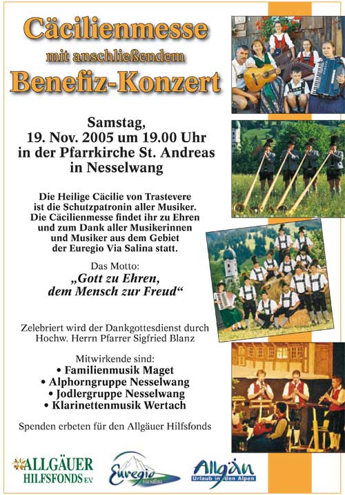 Im Anschluss an die Cäcilienfeier gestalten die mitwirkenden Musik- und Gesangsgruppen ein halbstündiges Benefizkonzert zu Gunsten des Allgäuer Hilfsfonds e.V. Info unter www. euregio-festival.de. Organisiert wird die Messe durch Euregio Arbeitskreismitglied Max Geist. Schirmherr ist Präsident Landrat Gebhard Kaiser.