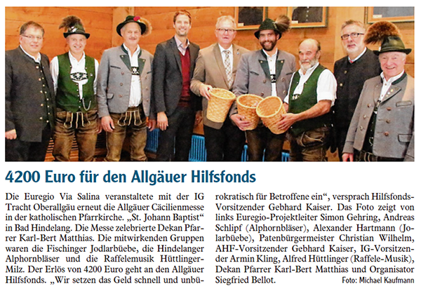 Insgesamt kamen bei beiden Konzerten Spenden in Höhe von 8050 Euro für die Kartei der Not und den Allgäuer Hilfsfonds zusammen. Weitere 1400 Euro erbrachte die Euregio-Cäcilienfeier in St. Mang, wo für die gute Sache musiziert und gesungen wurde.